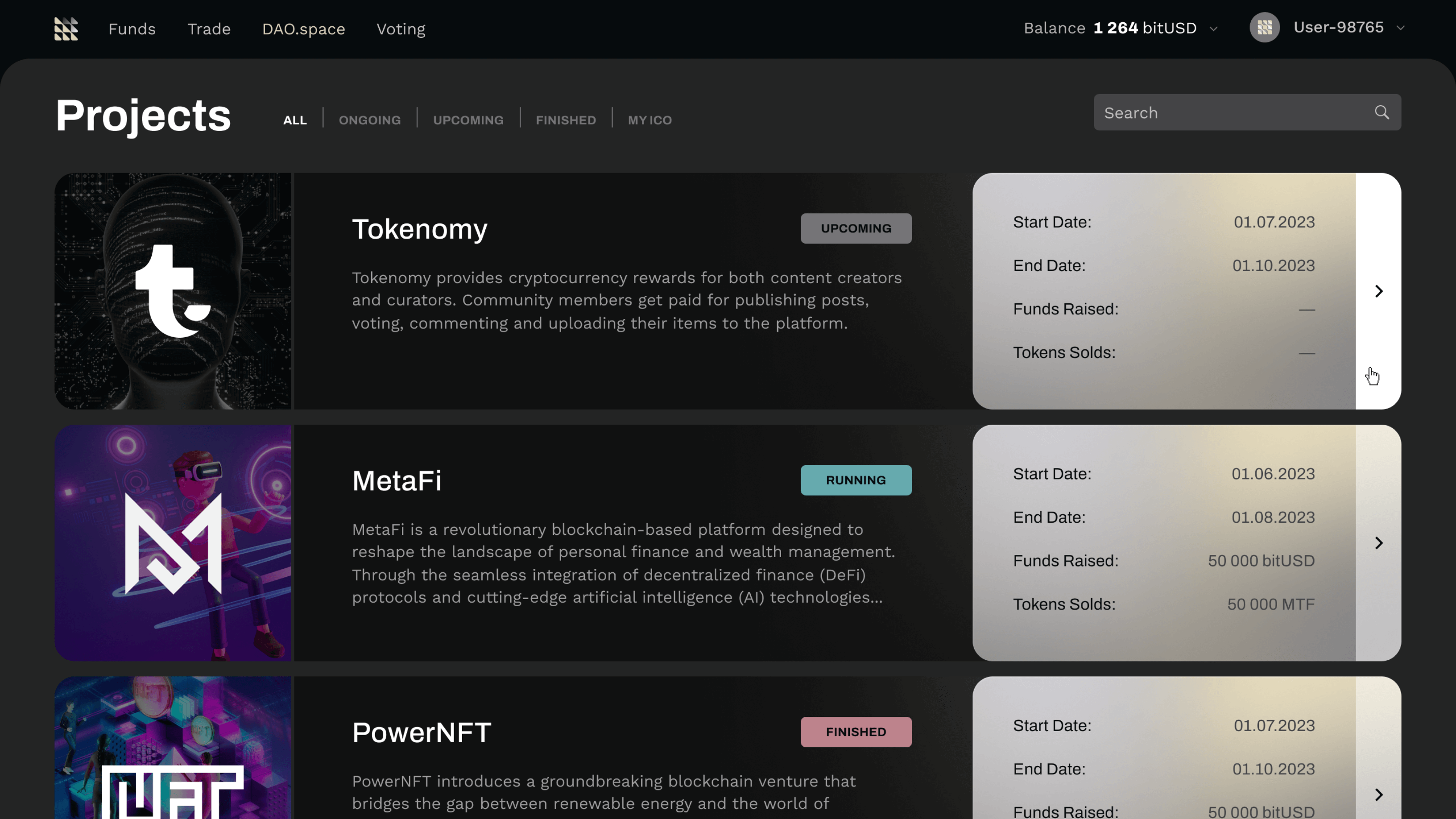 Investoren können ganz einfach alle Projekte durchsuchen, an denen sie interessiert sind. Für ein Extra an Komfort sind diese in alle, aktuelle, bevorstehende, abgeschlossene und ihre eigenen ICOs unterteilt.