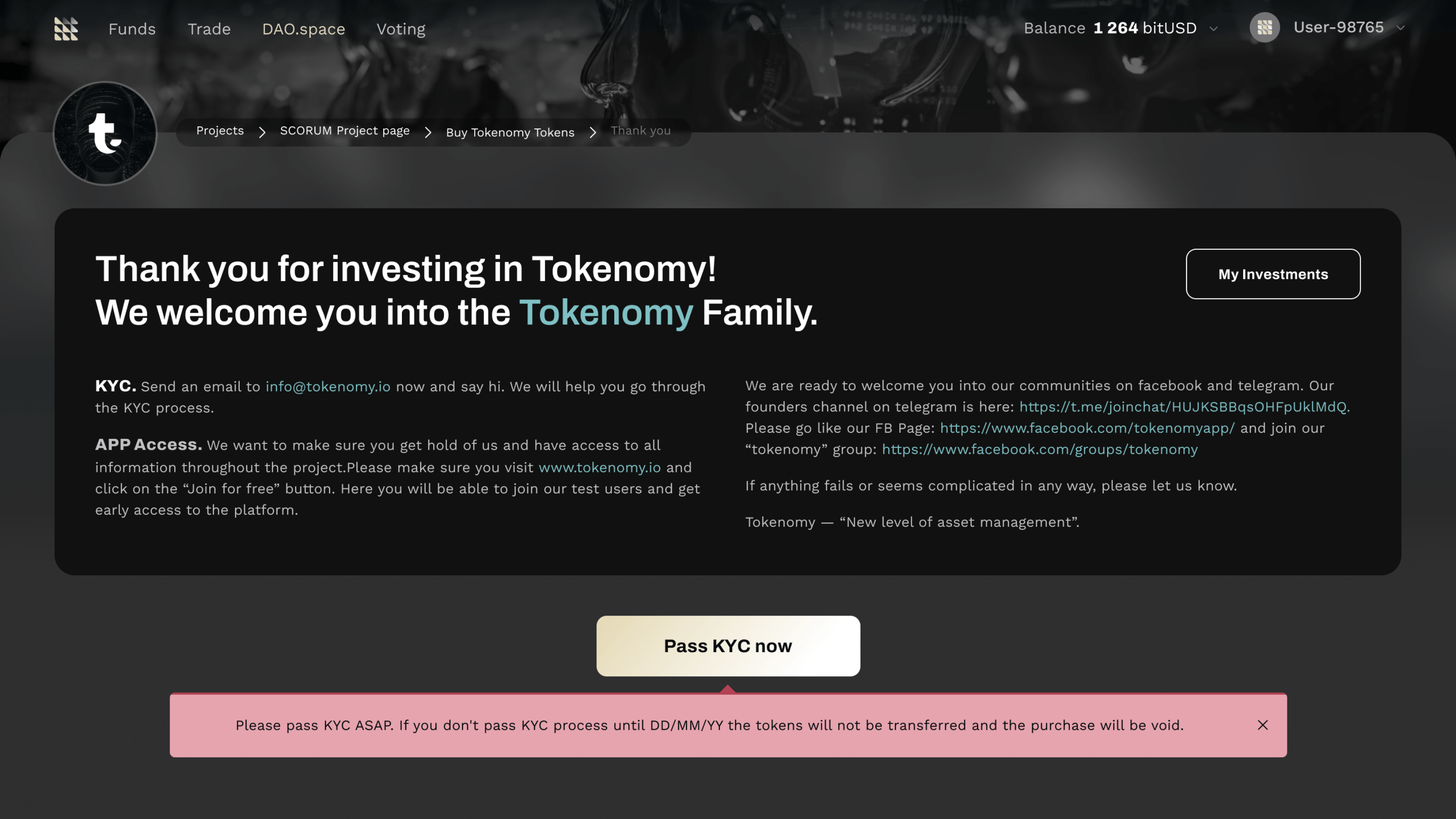Wir heißen alle Investoren auf DAO Space willkommen - ganz gleich, ob es sich dabei um Frühphasen-, ICO- oder rundenbasierte Projekte handelt. Beachten Sie bitte, dass Sie die KYC-Regularien für jedes Projekt, in das Sie investieren möchten, eingehalten werden müssen, um als autorisierter Projektinvestor fungieren zu können.