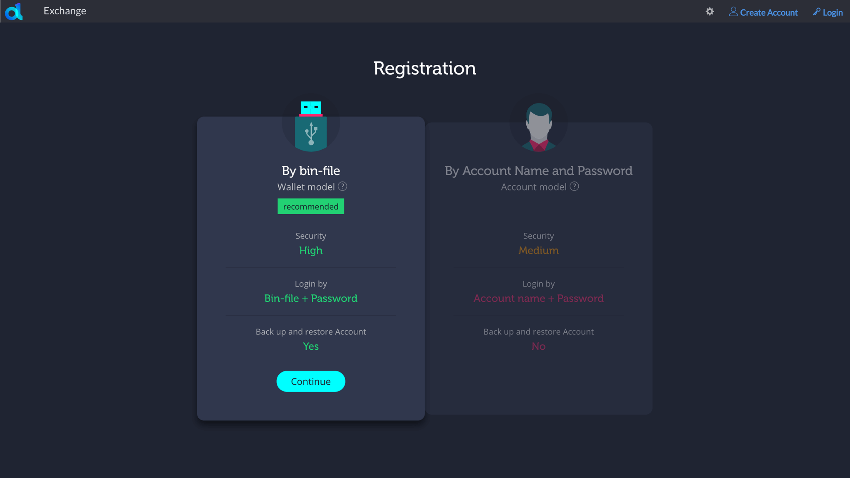 DEX bietet zwei frei wählbare,flexible und bequeme Registrierungsmöglichkeiten: das Wallet-Modell (sicherer) oder Kontomodell.