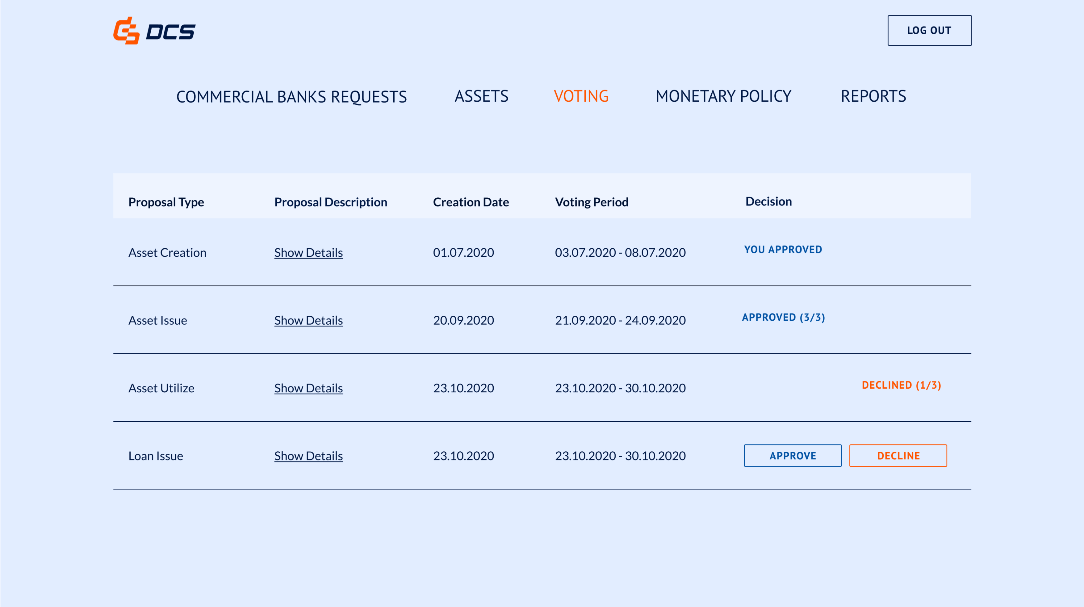 Alle Operationen mit Vermögenswerten und Krediten werden zunächst als Anträge bzw. Vorschläge bearbeitet. Jeder einzelne durchläuft den Abstimmungsprozess, bei dem eine positive Lösung erzielt wird, wenn ⅔ der Abstimmenden (also die Mehrheit) eine positive Entscheidung getroffen haben.