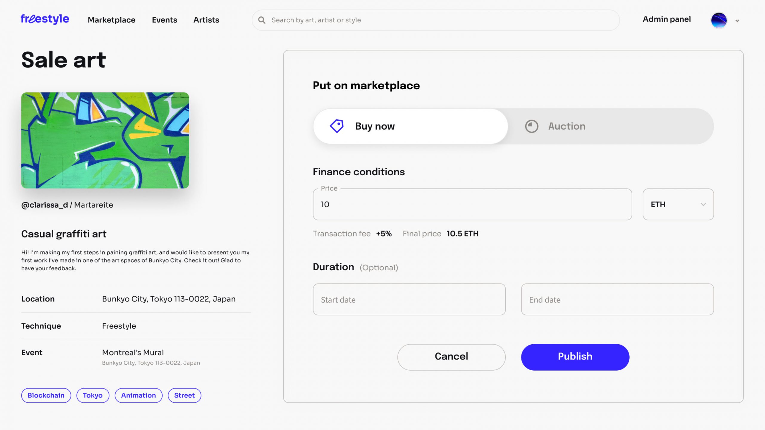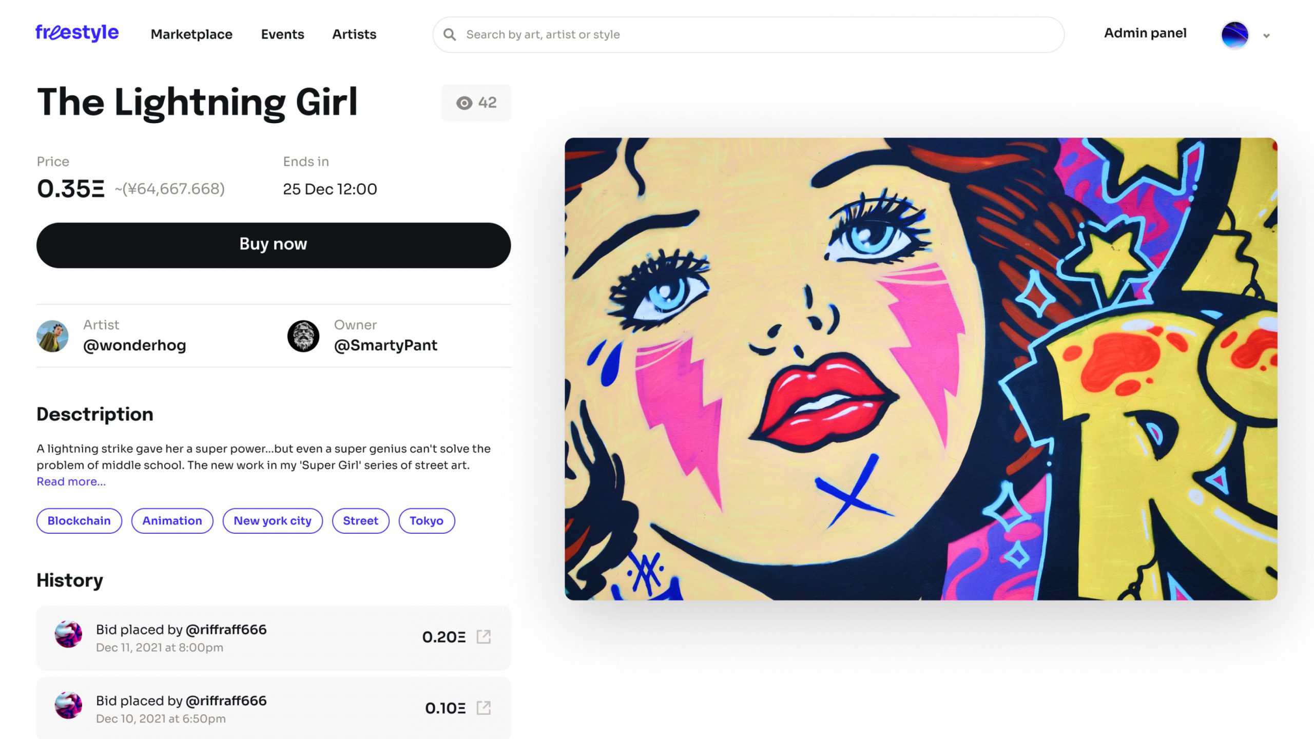 Bieten Sie Streetart-Künstler:innen neue Möglichkeiten, indem Sie ihnen ermöglichen, ihre Werke als NFTs zu handeln. FreeStyle NFT ist eine bahnbrechende Lösung, die die Grenzen des Straßenkunst-Bereichs auflöst und eine Plattform für einfachen NFT-Handel schafft, selbst für Krypto-Neulinge! Lassen Sie Streetart-Künstler:innen ihre Werke mit FreeStyle NFT, einem neuen „Zuhause“ für unabhängige Kunst, monetarisieren!