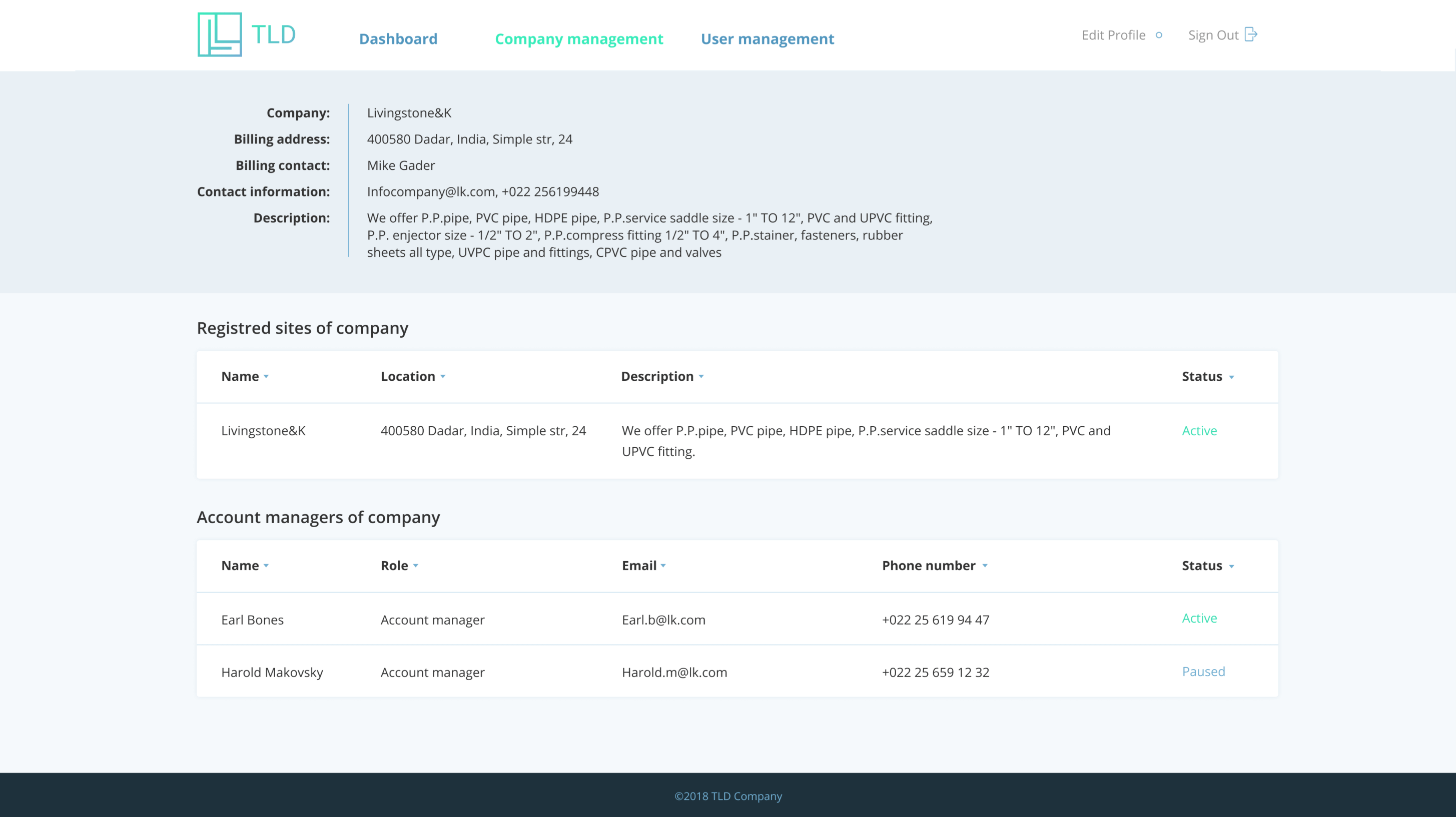 Im speziellen Tab können Sie alle Rohre-betreffende Informationen Ihres Unternehmens einsehen, einschließlich registrierter Standorte und zugehöriger Account-Manager.