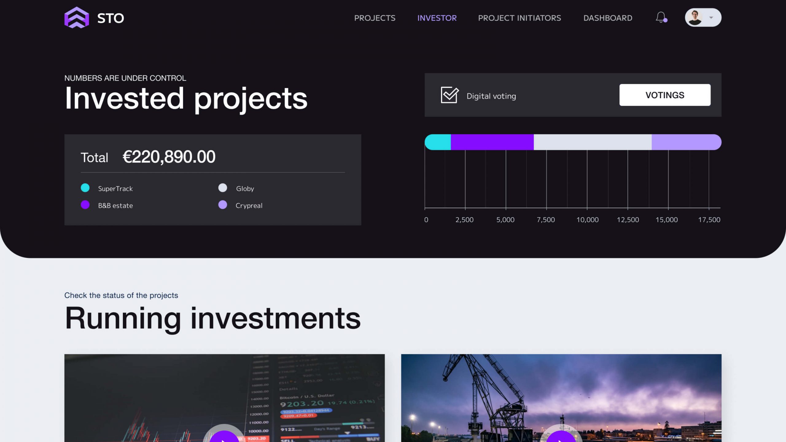 Unsere Lösung verfügt über ein spezielles Menü für Investoren, in dem sie den Fortschritt aller ihrer aktiven Projekte (die, der gekauften Token) verfolgen können.