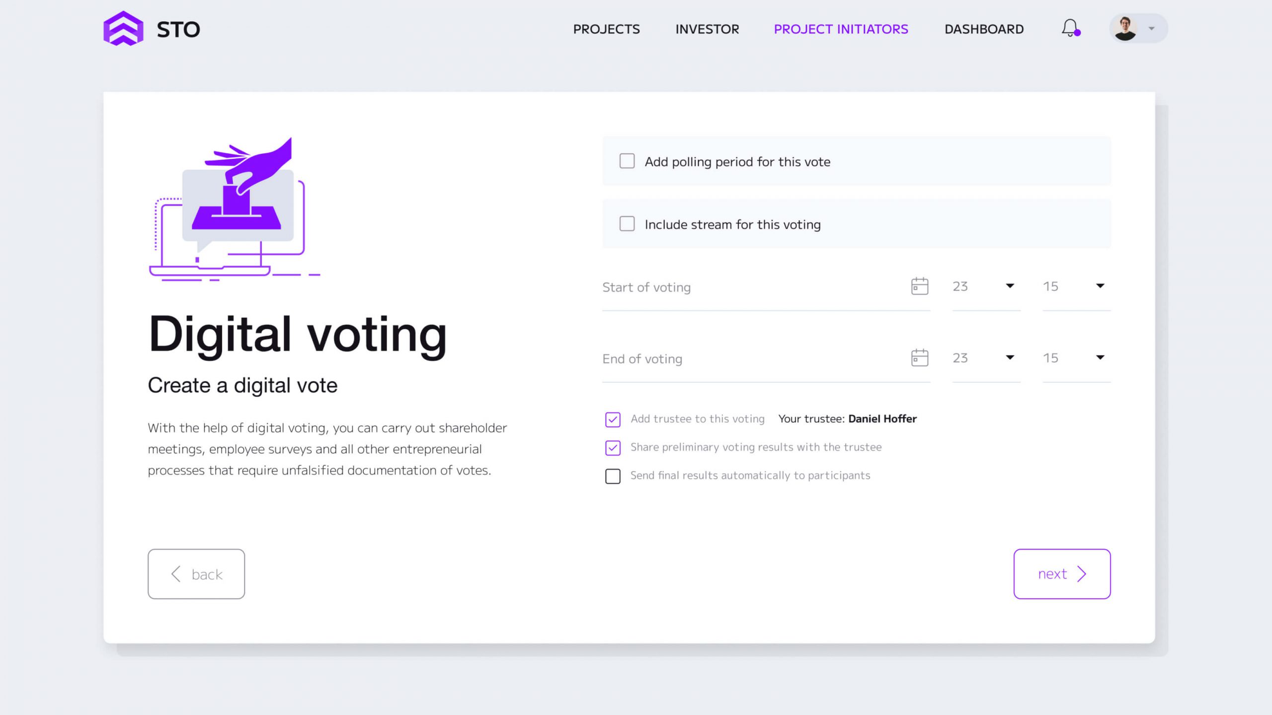 Mit der STO Plattform führen wir ein Blockchain basiertes Abstimmungssystem ein. Jeder Token-Inhaber kann sich an der Abstimmung über geschäftsrelevante Fragen beteiligen. Das Stimmgewicht hängt dabei von der Anzahl der Token ab, die der Abstimmende besitzt.