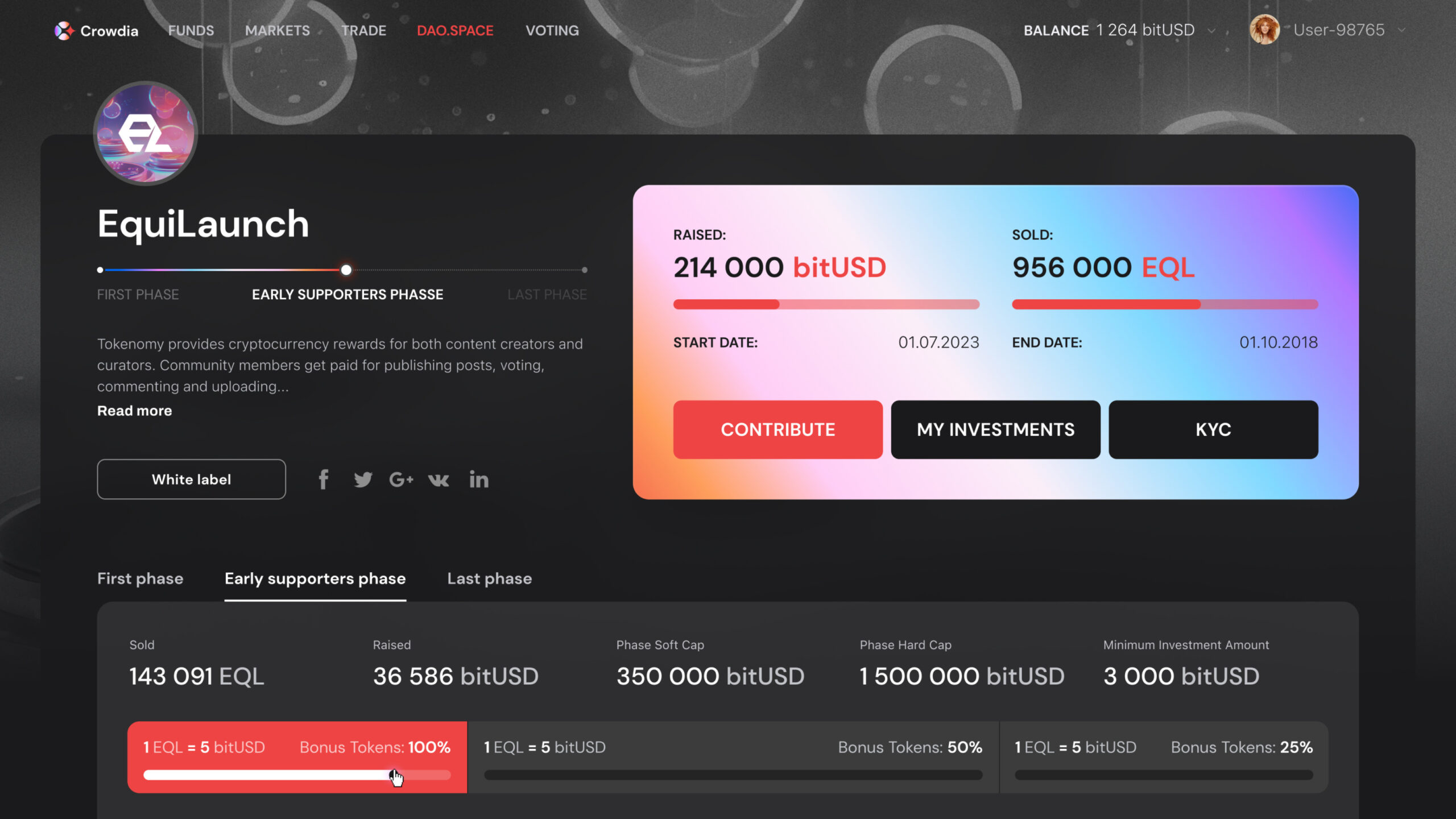 Eine White-Label-Crowdfunding-Plattform verbindet die Gemeinschaften von Startups und Investoren in einem einzigen, dezentralen und transparenten Ökosystem. Dort können Organisationen Entscheidungen vollständig autonom und demokratisch durch Mehrheitskonsens treffen, der dank Blockchain erreicht wird.