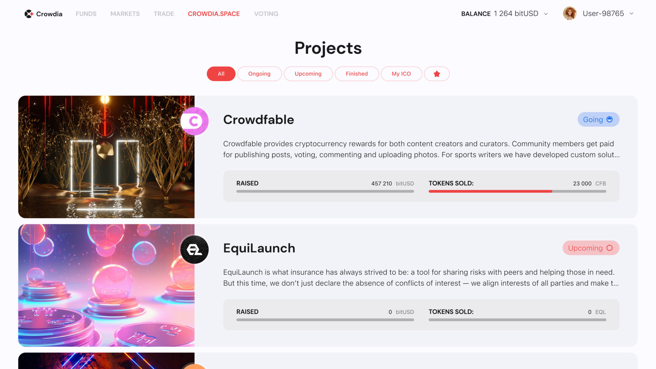 Tokenized real estate Investoren können problemlos Projekte durchsuchen, die sie interessieren; zu ihrer Bequemlichkeit sind diese in alle, laufende, kommende, abgeschlossene und ihre eigenen ICOs unterteilt.
